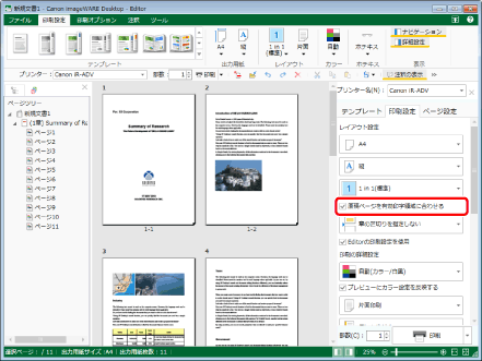 出力用紙サイズの設定で[自動(サイズ)]を選択し、[原稿ページを有効印字領域に合わせる]にチェックマークを付けずに印刷を行う場合、原稿ページごとに自動的に選択される出力用紙サイズが原稿サイズよりも小さい場合があります。このとき、出力用紙サイズを超える範囲は印字されない場合があります。
