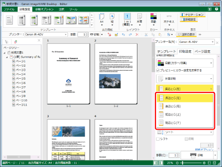 詳細ウィンドウ > [印刷設定]タブ > [印刷の詳細設定]で、とじ方向を選択します。
