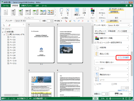詳細ウィンドウ > [印刷設定]タブ > [印刷の詳細設定]で、[とじしろの設定]をクリックします。