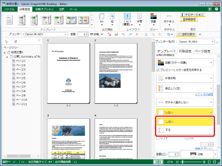 キヤノン製プリンターを選択し、詳細ウィンドウの[印刷設定]タブ、リボンのコマンド、ツールボタンのいずれかで、[Editorの印刷設定を使用]にチェックマークを付けた場合に設定できます。