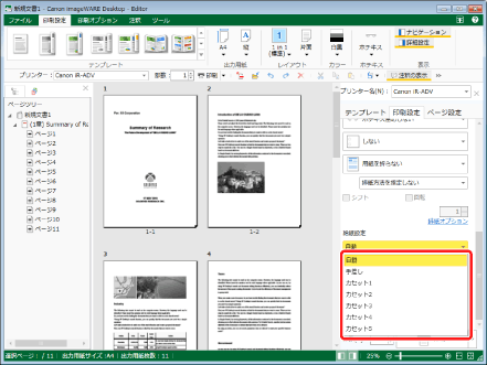 キヤノン製プリンターを選択し、詳細ウィンドウの[印刷設定]タブ、リボンのコマンド、ツールボタンのいずれかで、[Editorの印刷設定を使用]にチェックマークを付けた場合に設定できます。