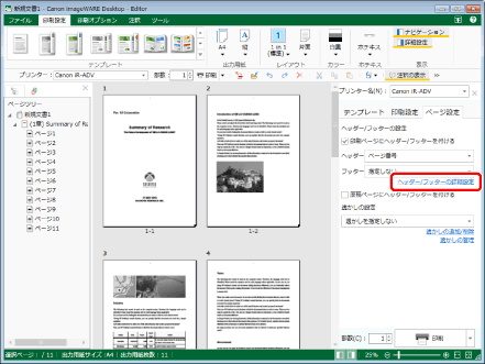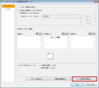 詳細ウィンドウ > [ページ設定]タブ > [ヘッダー/フッターの設定]で、[ヘッダー/フッターの詳細設定]をクリックします。