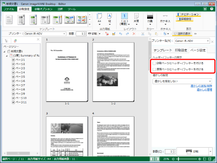 詳細ウィンドウ > [ページ設定]タブ > [ヘッダー/フッターの設定]で、[印刷ページにヘッダー/フッターを付ける]にチェックマークを付けます。