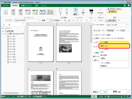 詳細ウィンドウ > [ページ設定]タブ > [ヘッダー/フッターの設定]で、各[ヘッダー]/[フッター]のプルダウンリストから、[フォント設定]を選択