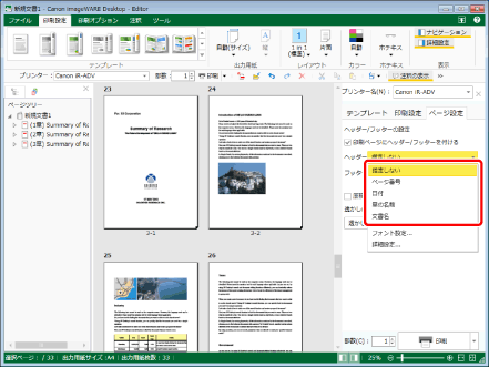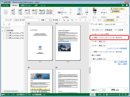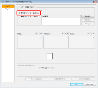 [印刷ページにヘッダー/フッターを付ける]、[原稿ページにヘッダー/フッターを付ける]ともに操作方法は同じです。