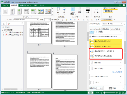 章の区切りを設定しない場合は、詳細ウィンドウ > [印刷設定]タブ > [レイアウト設定]で、[章の区切りを指定しない]を選択します。または、リボンの
