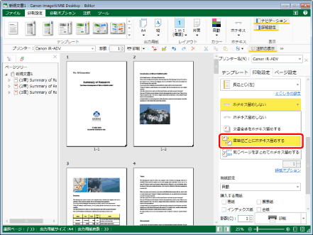 詳細ウィンドウ > [印刷設定]タブ > [印刷の詳細設定]で、[章単位ごとにホチキス留めする]を選択します。