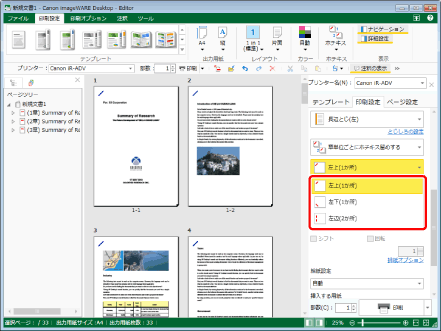 詳細ウィンドウ > [印刷設定]タブ > [印刷の詳細設定]で、ホチキスの位置を選択します。