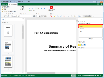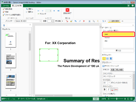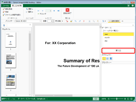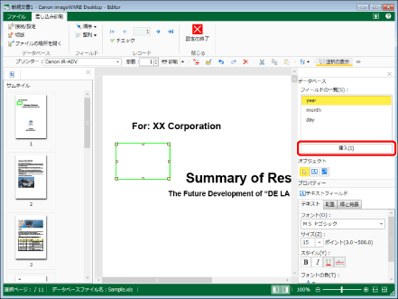 ここでは、詳細ウィンドウの[データベース]からテキストフィールドを挿入する方法について説明します。