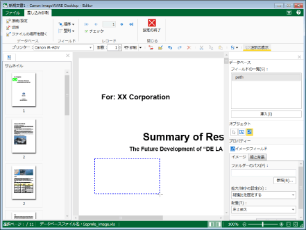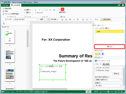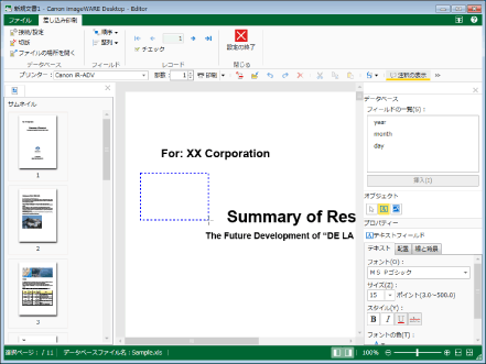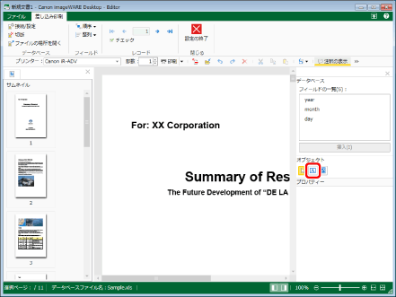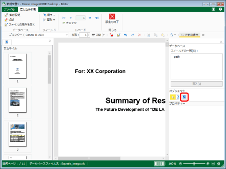 テキストフィールド、およびイメージフィールドをページに挿入すると、ナビゲーションウィンドウのサムネイルにフィールドが表示されます。