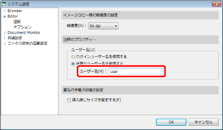 コンピューターにログインしているユーザー名を使用する場合、[システム設定]で[ログインユーザー名を使用する]を選択します。