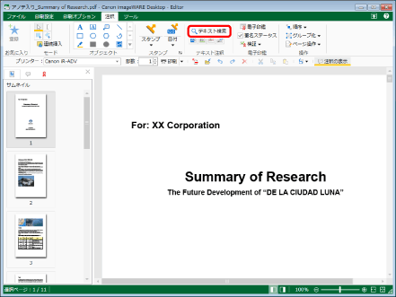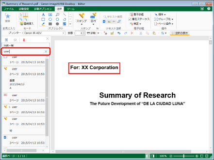 検索対象は、ナビゲーションウィンドウの[注釈一覧]タブに表示される次の注釈の文字列、ユーザー名、更新日時、およびページ番号が対象となります。