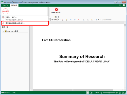 リボンの電子印鑑一覧の をクリックして、[自己署名証明書の削除]を選択します。