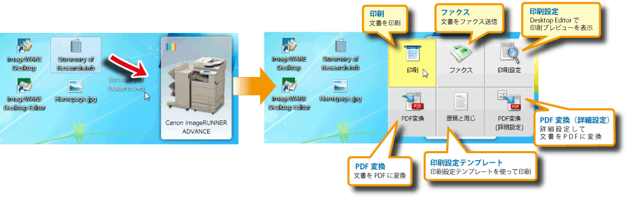 簡単印刷ツールは、印刷/ファクス送信などのデバイスの機能をより直感的に操作できるアプリケーションです。簡単印刷ツールを作成すると、使用しているプリンター/ファクスを見やすいアイコンでWindowsのデスクトップ画面に表示します。