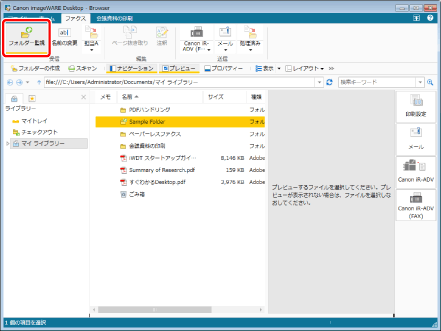 未接続のDocument Serverライブラリー、または認証の必要なネットワークドライブ上のライブラリー内にあるフォルダーを選択する場合は、ライブラリーへの接続が必要です。接続方法については、次を参照してください。