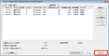 エクスポートの処理実行中は[終了]ボタンが無効になります。Data Converter Exporterを終了するには、エクスポート処理が終了するのを待つか、[停止]をクリックして処理を中断してから[終了]をクリックします。