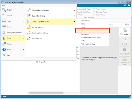 Fax output buttons registered on the output bar can also be displayed on the ribbon or toolbar. For information on displaying them, see the following.