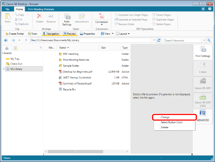 for the application output button displayed on the ribbon or toolbar and selecting [Change]. If an output button is not displayed on the ribbon or toolbar, see the following to display one. |