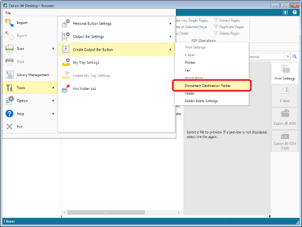 A Document Destination Folder can also be created from Desktop Editor. To create a Document Destination Folder from Desktop Editor, select the [File] menu > [Settings/Management] > [Create Document Destination Folder].