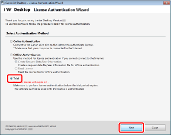 An Internet connection is required when authenticating a trial license.