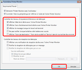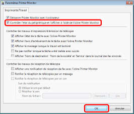 Vérifiez que la case [Contrôler l'état du périphérique et l'afficher à l'aide de l'icône Printer Monitor] est cochée, puis cliquez sur [OK].