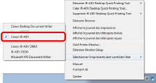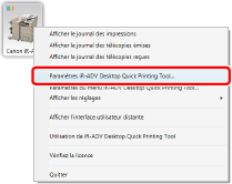 Cliquez avec le bouton droit de la souris sur Quick Printing Tool où sont enregistrés les périphériques à contrôler, puis sélectionnez [Paramètres iR-ADV Desktop Quick Printing Tool].