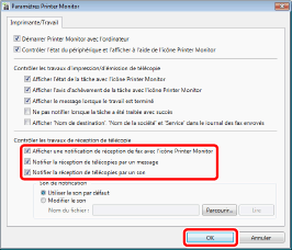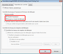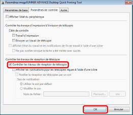 Cochez la case [Contrôler les travaux de réception de télécopie] de l'onglet [Paramètres de contrôle], puis cliquez sur [OK].