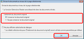 Pour afficher de nouveau la boîte de dialogue [Diviser le document au niveau de la page sélectionnée], sélectionnez [Sélectionnez le traitement du document original lors de la division d'un document à la page sélectionnée].