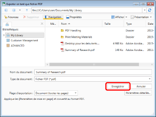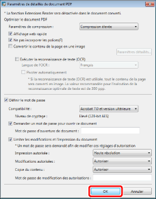 Si vous sélectionnez [Configurer les détails et convertir en document PDF], la boîte de dialogue [Paramètres de détaillés de document PDF] s'affiche.
