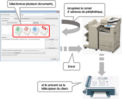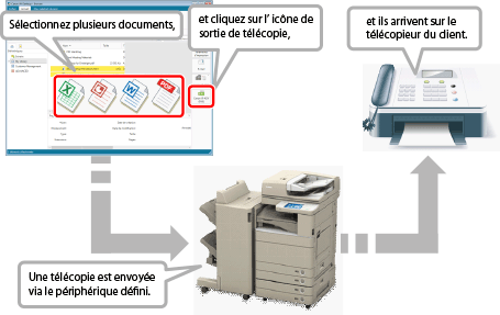 Pour envoyer plusieurs documents par télécopie en tant que document unique, définissez [Combiner les documents sélectionnés en un seul avec Editor pour l'envoi de la télécopie] dans les paramètres du bouton de sortie du télécopieur. Pour plus d'informations sur la configuration de ces paramètres, consultez la section suivante.