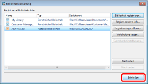 Prüfen Sie, ob der Empfänger unter [Registrierte Bibliotheksliste] hinzugefügt wurde, und klicken Sie auf [Schließen].