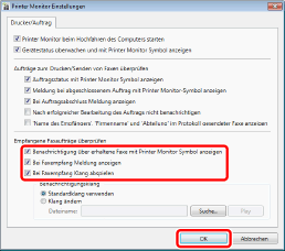 Aktivieren Sie das Kontrollkästchen [Empfangene Faxaufträge überprüfen] auf der Registerkarte [Überwachungseinstellungen], und klicken Sie auf [OK].