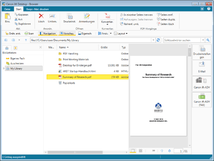 Dokumente in Bibliotheken können über den Desktop Browser-Bildschirm gedruckt, per Fax oder per E-Mail gesendet und bearbeitet werden. Da Ordner in einer Bibliothek und externe Geräte wie z. B. imageRUNNER ADVANCE überwacht werden können, lassen sich auf dem Desktop Browser-Bildschirm der Status von hinzugefügten oder aktualisierten Dokumenten und der Status von externen Geräten prüfen.