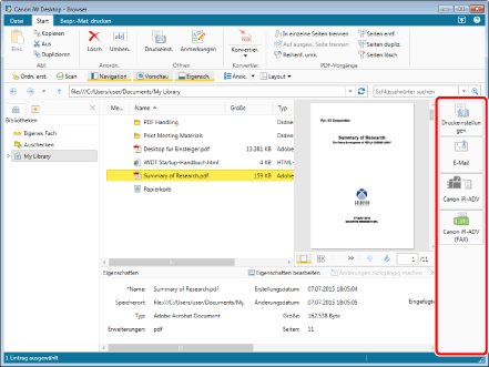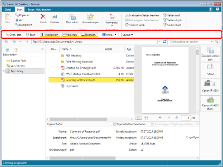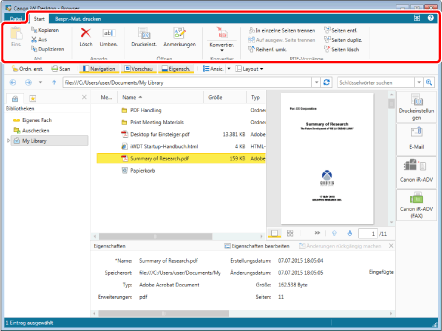 Das Menüband enthält Registerkarten mit Befehlen für die Durchführung von Vorgängen und die Bearbeitung von in Bibliotheken gespeicherten Dokumenten sowie Befehle für das Drucken von Materialien.