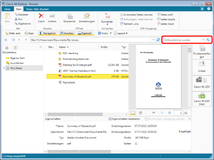 Der Desktop Browser-Bildschirm umfasst ein "[Datei]-Menü", ein "Menüband", "Fenster" und "Leisten". Dokumente und Ordner können auf einem separaten Suchbildschirm durchsucht werden.