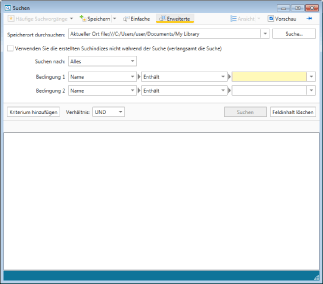 Der Suchbildschirm enthält auch die Elemente zur Konfiguration detaillierter Suchbedingungen, zur Ausführung einer Suche und zum Speichern von Suchbedingungen.