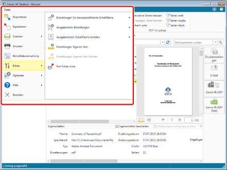 Das [Datei]-Menü enthält die Funktionen im Zusammenhang mit dem Desktop Browser wie z. B. Drucken und Scannen sowie Elemente für die Konfiguration des gesamten Desktops.
