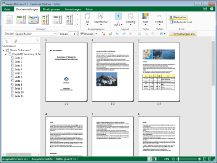 Desktop Editor fügt Druckeinstellungen zu Dokumenten hinzu und gestattet Ihnen, Vorgänge wie z. B. das Anpassen und Bearbeiten von Dokumenten auszuführen. Außerdem können Sie Dokumente kombinieren, ihre Seitenreihenfolge ändern und nicht benötigte Seiten löschen. Wenn Sie im Format IWB (*.iwb) speichern, können Sie die Druckeinstellungen mit dem Dokument speichern.