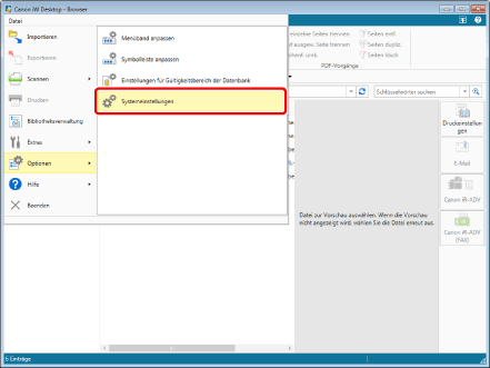 Wählen Sie im Menü [Datei] > [Optionen] > [Systemeinstellungen].