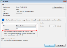 Die Eingabereihenfolge unter [Bereich] entspricht nicht der Reihenfolge beim Senden. Unabhängig davon, ob Sie "1,2" oder "2,1" eingeben, werden die Seiten in der Reihenfolge "1,2" gesendet.