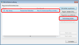 Wählen Sie die Bibliothek aus, deren Verbindung getestet werden soll, und klicken Sie dann im [Bibliotheksverwaltung]-Dialogfeld auf [Verbindung testen].