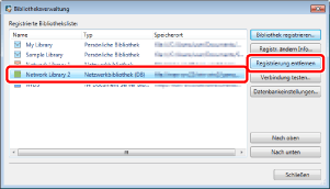 Wählen Sie eine Bibliothek aus, deren Registrierung aus [Registrierte Bibliotheksliste] entfernt werden soll, und klicken Sie dann auf [Registrierung entfernen].