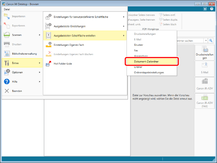 Sie können einen Dokument-Zielordner auch in Desktop Editor erstellen. Zum Erstellen eines Dokument-Zielordners in Desktop Editor wählen Sie das Menü [Datei] > [Einstellungen/Verwaltung] > [Erstellen Sie einen Dokument-Zielordner].