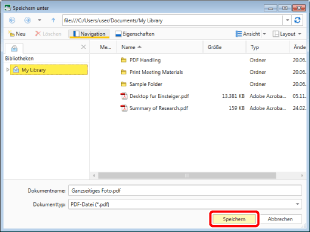 Wenn das Dialogfeld [Speichern unter] angezeigt wird, wählen Sie die zu speichernde Bibliothek oder den zu speichernden Ordner, und klicken Sie auf [Speichern].