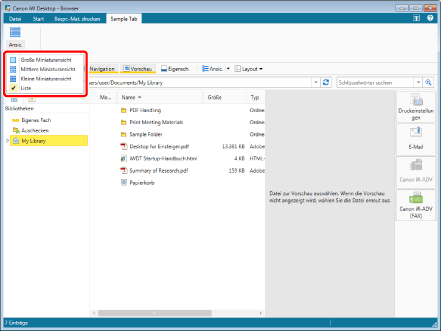 Im Dateilistenfenster können Sie die Dokumentansichtsmethode auswählen: Miniaturansicht oder Listenansicht.