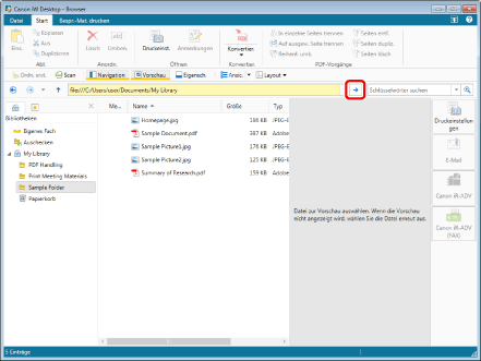 Wenn Sie einen Dokumentpfad in die Adressleiste eingeben, wird der Ordner, in dem das Dokument gespeichert ist, im Navigationsfenster angezeigt. Das Dokument wird im Dateilistenfenster ausgewählt, die mit dem Dokument verknüpfte Anwendung wird aufgerufen und das Dokument wird angezeigt.