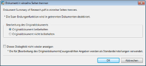 Von nun an wird das Dialogfeld [Dokument in einzelne Seiten trennen] nicht mehr angezeigt. Der in [Bearbeitung des Originaldokuments] gewählte Bearbeitungsmodus wird im Originaldokument verwendet.