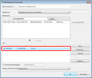 Wenn der zu verwendende Faxtreiber nicht G3/G4 unterstützt, wird die Faxnummer in [Name des Empfängers] angezeigt und die Felder [Fax-Typ] und [Übertragungsmodus] sind leer. Wählen Sie zur Korrektur in [Ziel] die Adresse aus und klicken Sie auf [Bearbeiten].