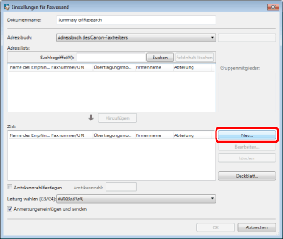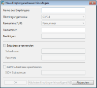 Wenn Sie eine unter [Ziel] hinzugefügte Adresse auswählen und auf [Bearbeiten] klicken, wird das [Neue Empfängeradressen bearbeiten]-Dialogfeld geöffnet. Sie können die Adresse im Dialogfeld bearbeiten.