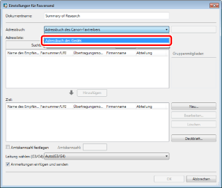 Zum Abrufen von Adressen für die IP-Faxfunktion aus dem Adressbuch eines imageRUNNER ADVANCE-Geräts muss Version 3.1.0 oder höher von Desktop Communicator auf dem imageRUNNER ADVANCE-Gerät installiert sein. Mit Version 3.0.0 oder früher werden nur die Empfängernamen abgerufen.